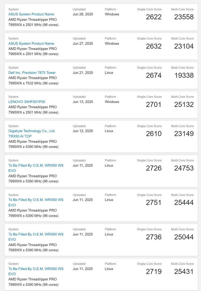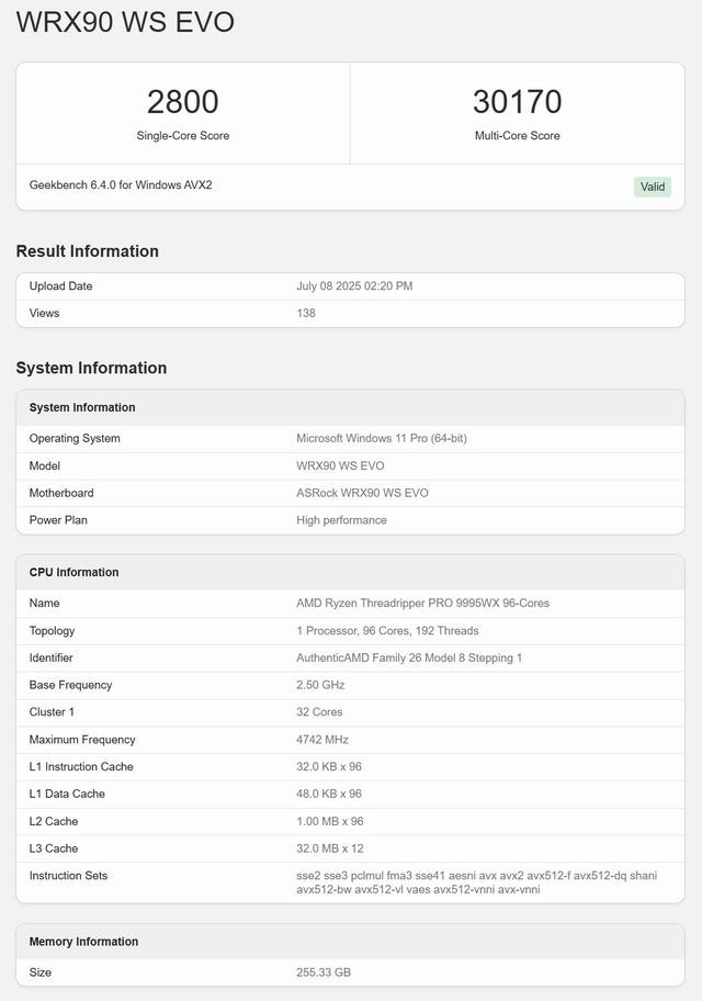 在Geekebench 6数据库中,一台配备了256GB和华擎WRX90 WS EVO主板的9995WX单核性能得分2800,多核心得分30170。