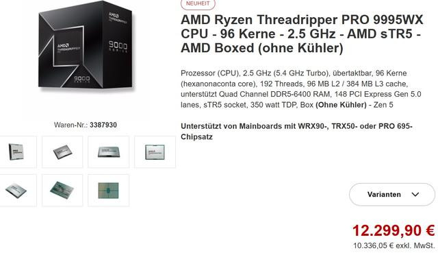 AMD新一代锐龙线程撕裂者旗舰型号AMD Threadripper PRO 9955WX正式上架欧洲电商平台,售价12299.9欧元,约合美元12794左右。